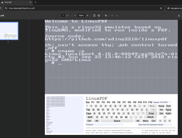 LinuxPDF s'inspire de DoomPDF. Il s'agissait d'exécuter Doom directement dans un fichier PDF en utilisant JavaScript et un portage modifié du code C de Doom. LinuxPDF propose la même chose : exécuter du C dans un document PDf en utilisant asm.js. Le développeur utilise une version modifiée de TinyEMU RISC-V pour asm.js. Et il utilise le même code d'affichage que DoomPDF. Le principal problème est la (grande) lenteur de l'émulateur. Il faut parfois plus d'une minute pour booter. L'affichage est tout aussi lent et parfois peu réactif. Les contraintes sont fortes.