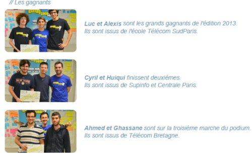 // Les participants 11 écoles ou universités étaient représentées lors de ce concours, parmi lesquelles : Ecoles des Mines de Paris, Centrale Lille, Centrale Paris, Telecom Bretagne, Supinfo, Ensimag, UTC, Mines de Nantes, Telecom SudParis, Telecom ParisTech, Université de Montpellier et Université de Champagne-Ardenne. D2SI a récompensé les trois meilleurs binômes d’étudiants en mettant en jeu 4 000 euros et des stages de fin d’études.