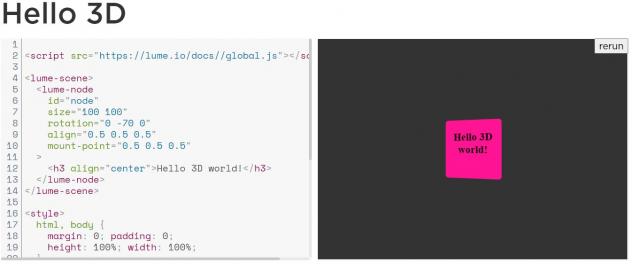 Les concepteurs de Lume soulignent que celle-ci permet d'écrire des scènes 3D de manière déclarative à l'aide d'éléments HTML personnalisés. Cela vous permet d'écrire des scènes 3D en utilisant des frameworks HTML populaires tels que (mais sans s'y limiter) React, Vue.js, Meteor, Angular, Ember.js, ou jQuery.