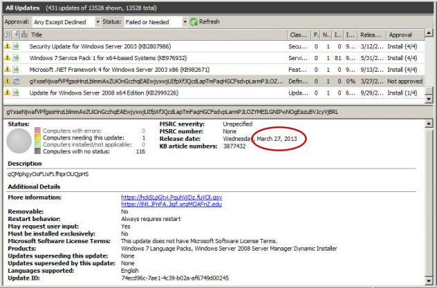 Fort heureusement, ce n'est pas de ça qu'il s'agit cette fois, même si ça y ressemblait fort :-). Il s'agissait tout simplement d'une mise à jour de test 'publiée' par erreur, a précisé Microsoft. Une mise à jour de test quand même pas très fraîche, car son timbre à date indique le 27 mars 2013 :-)