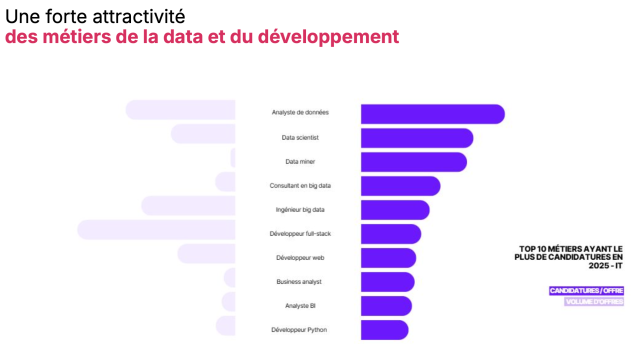Les métiers et profils autour de l'IA progressent fortement, là encore, tout sauf une surprise. En 2025, trois profils de développeurs sont reçus le plus de candidatures :