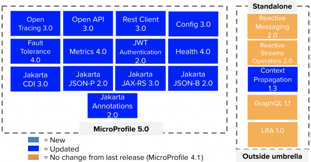 MicroProfile 5.0 permet d'utiliser les API MicroProfile avec Jakarta EE 9.1 (espace de noms Jakarta EE). Cette version est principalement axée sur la mise à jour des dépendances de javax vers jakarta, ainsi que sur les améliorations globales de la stabilité et de la convivialité, expliquent les responsables du projet.