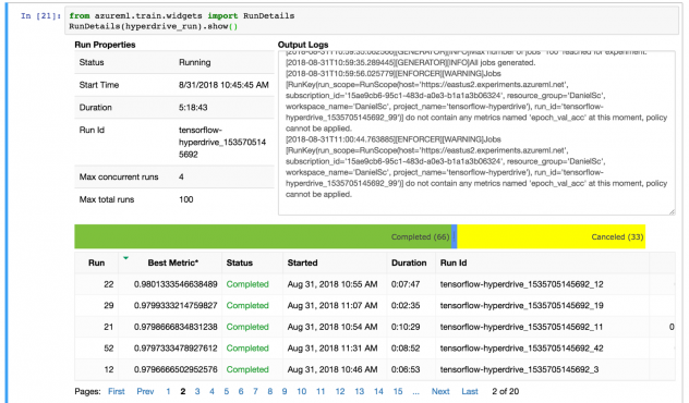 Ils constituent un environnement de développement populaire pour les scientifiques travaillant en Python. Le service Azure Machine Learning fournit une prise en charge des ordinateurs portables locaux et hébergés (tels qu'Azure Notebooks), ainsi que des widgets intégrés permettant aux experts en données de surveiller visuellement l'avancement des travaux de formation en temps réel, comme illustré dans l'image ci-dessous.