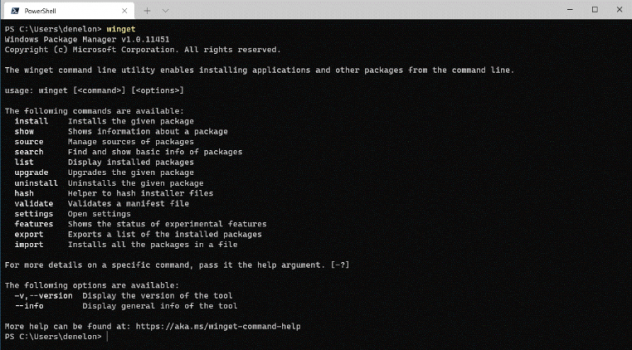 Windows Package Manager est un ensemble d'outils. Concrètement, Le client winget est le principal outil que vous utiliserez pour gérer les paquets sur votre machine. L'illustration ci-dessous montre le client winget exécuté dans le terminal Windows via PowerShell. Vous pouvez voir la liste des commandes disponibles utilisées pour gérer les packages et travailler avec les manifestes.