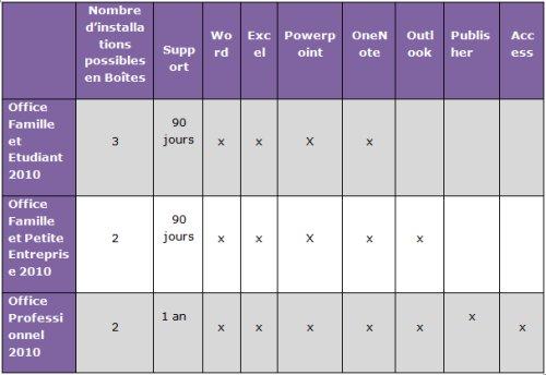 - Office Famille et Petite Entreprise 2010, une édition comprenant OneNote, Word, Excel, PowerPoint et Outlook et permettant à un utilisateur de l’installer simultanément sur son PC fixe et son PC portable.