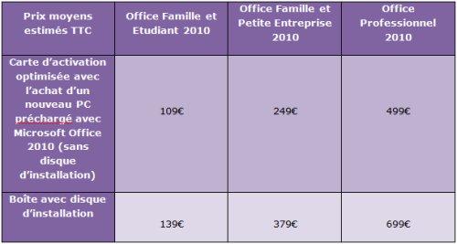 Prix moyens estimés des différentes versions d’Office 2010 pour le grand public et les petites entreprises: