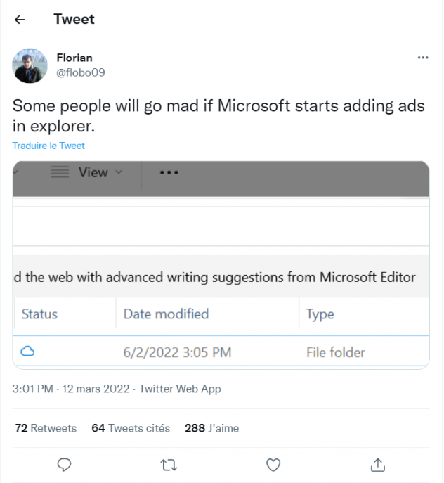 Contacté notamment pas notre confrère Bleeding Computeur, Microsoft ne s'est pour l'instant pas exprimée à ce sujet. Selon nos informations, tous les membres du programmes Insider n'ont pas vu ces publicités dans l'explorateur de fichiers. Il est possible que Microsoft soit seulement dans une phase d'expérimentation.