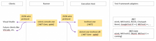 VS Test est une plateforme extensible qui lance des tests, collecte les données de diagnostic et génère des rapports. Elle supporte les tests en provenances de nombreux framexorks de test grâce à un modèle d'adaptateur pluggable. Les adaptateurs communiquant avec la plate-forme VS Test au moyen d'une API exposée par celle-ci.