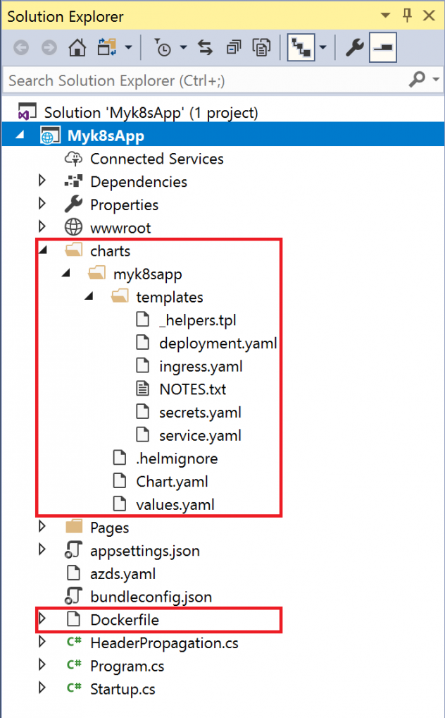 Pour soulager ces difficultés, Microsoft propose Visual Studio Kubernetes Tools, pour le moment en préversion. Une fois cette suite d'outils installée, il est possible decréer un nouveau projet "Application conteneur pour Kubernetes" ou ajouter le support Kubernetes à une application Web .NET Core existante. A ce moment, Visual Studio crée automatiquement un fichier Docker et un graphique Helm pour votre projet. Vous pouvez créer une image conteneur pour exécuter votre application ou utiliser ces fichiers pour les déployer sur n'importe quel cluster Kubernetes. Ces outils s'intègrent également à Azure Dev Spaces , pour un développement itératif directement dans Azure Kubernetes Service.