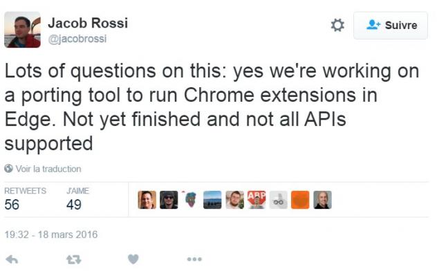 Dans le même ordre d'idée, Microsoft travaille à un outil de portage des extensions Chrome vers Edge. Cette informations a été tweetée par Jacob Rossi, ingénieur dans l'équipe Edge chez Microsoft. Au départ les informations disponibles donnaient à penser que les extensions de Chrome tourneraient directement dans Edge ou avec des modifications minimales du code. Mais finalement Microsoft proposera un outil de portage qui est en cours de développement et qui ne supporte pas toutes les API pour le moment. La date de sa disponibilité finale n'est pas annoncée.