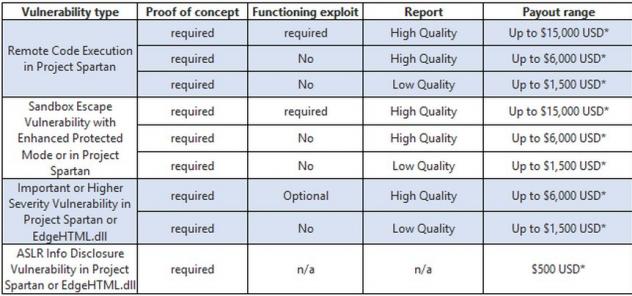 Microsoft est conscient de cela, et lance un programme Bug Bounty pour améliorer la sécurité de Spartan. Chacun peut y participer tant qu'il ne fait pas partie du personnel de Microsoft ou de ses filiales, ou qu'il ne réside pas dans des pays sous sanctions américaines (Cuba, Syrie, etc.). Les sociétés ne sont pas admises en tant qu'entités. Seuls des individus peuvent participer à ce programme. Un chercheur en sécurité employé dans une entreprise travaillant dans ce secteur, peut participer à titre individuel.