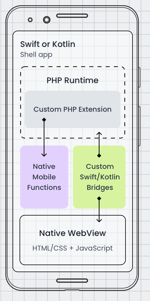 Le coeur de l'app est en PHP. Le tout est embarqué dans une application shell Kotlin ou Swift. Sur la partie mobile, NativePHP supporte : caméra, authentification de type FaceID, TouchID, les notifications, les retours haptiques, accès la lampe touche, sécurité du stockage, localisation.
