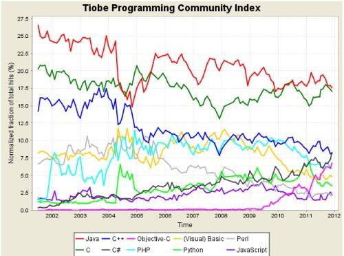 TIOBE a publié le bilan de l'année 2011 en ce qui concerne la popularité des langages. Le classement TIOBE n'est pas nécessairement le reflet exact de la réalité, puisqu'il est établi uniquement à partir d'informations piochées sur le Web, comme des mots-clés dans les moteurs de recherche, ou les annonces de formations proposées sur divers sites. Toutefois TIOBE est un bon indicateur de tendance.