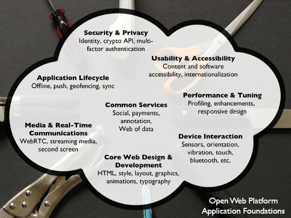 Selon Jeff Jaffe, pour que HTML5 se généralise dans de bonnes conditions, il est crucial que les développeurs disposent d'un socle commun, constitué d'outils fondamentaux. Pour cela Jeff Jaffe prône la mise au point d'une application foundation, qui serait le résultat d'un chantier comparable à celui d'un système d'exploitation : construction de module de bas niveau, qui seraient autant de briques et qui seraient fédérées par des outils de plus haut niveau, pour fournir un ensemble capable d'adresser 8 composantes essentiel du développement Web : la sécurité et confidentialité ; le Web Design et le développement ; l’interaction avec les appareils ; le cycle de vie des applications ; la communication temps réel (RTC) ; la performance ; l’ergonomie et l’accessibilité ; les services.