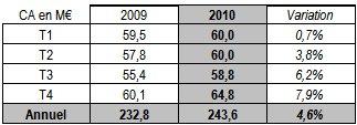 Au cours du 4ème trimestre 2010, Osiatis a connu une nouvelle accélération de sa croissance. A 64,8M€ son chiffre d'affaires progresse de +7,9%, dont +5% organique, par rapport à la même période de 2009, et atteint ainsi le plus haut niveau pour un trimestre enregistré à ce jour. Sur l'ensemble de l'année, le Groupe a réalisé un chiffre d'affaires de 243,6M€ en hausse de +4,6% dont +3,3% en organique.