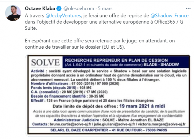 Octave Klaba, fondateur d'OVH, est sur les rangs. Dans un tweet il a annoncé son intention de reprendre Blade. Est-ce à dire que OVH va sa lancer dans le cloud gaming ? Non. Selon le tweet d'Octave Klaba, son intention est de développer une alternative européenne à Office365 / G-Suite.