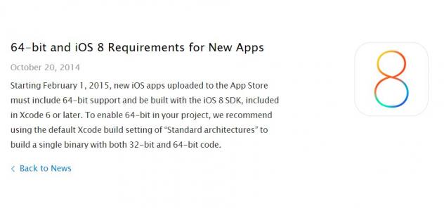 Apple, qui entend bien faire la transition vers le 64 bits sans accroc et sans perte de temps, pousse les développeurs pour cela. C'est ainsi que la firme à la pomme leur a adressé un email, et publié un message sur son site développeurs, pour les informer qu'à partir du 1er février 2015, leurs applications devront supporter le 64 bits pour être acceptées sur l'Apple Store.