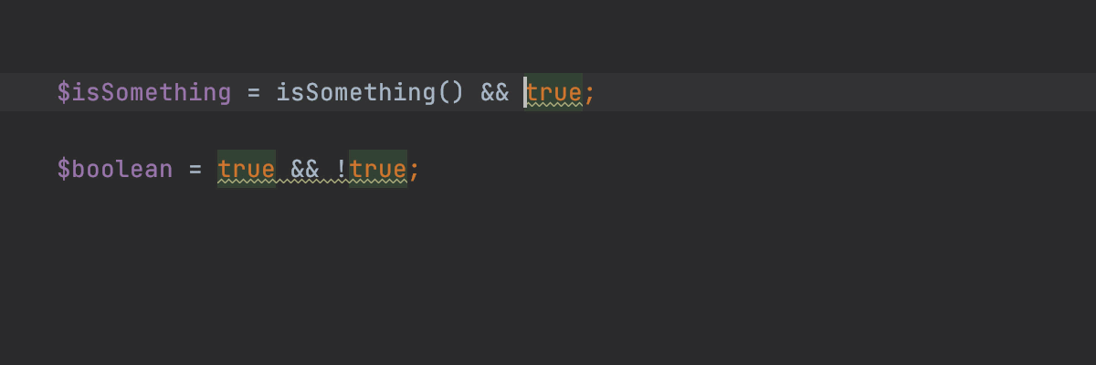 Si une expression booléenne contient des littéraux true ou false, PhpStorm peut aider à la simplifier, comme le montre l'animation ci-dessous :