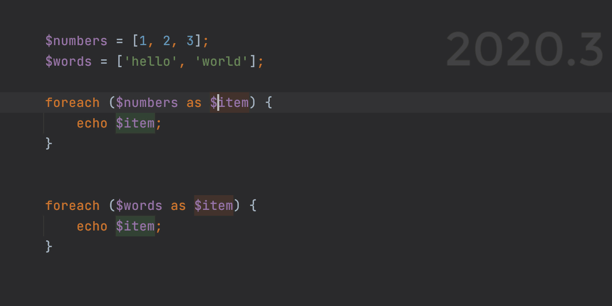 En PHP, les constructions de boucle comme les blocs foreach, for, while et catch n'ont pas de portée isolée. Cela peut poser problème si vous souhaitez renommer une variable uniquement à l'intérieur d'un bloc. PhpStorm 2021.1 introduit une portée synthétique pour de tels blocs. La refactorisation rename sera donc plus intuitive.