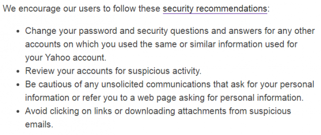 Yahoo! indique qu'elle commence à envoyer des mails à tous les utilisateurs potentiellement affectés par ce piratage et se fend de quelques conseils de sécurité ;-) dans son annonce : changer son mot de passe, surveiller les activité suspecte dans son compte, faire attention aux communications non sollicitées et ne pas cliquer sur des liens dans des mails suspects.