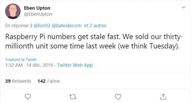 En réponse à une publication sur Twitter, Eben Upton, PDG de la Fondation Raspberry Pi, a annoncé qu'il avait vendu son trente-millionième Raspberry Pi.
