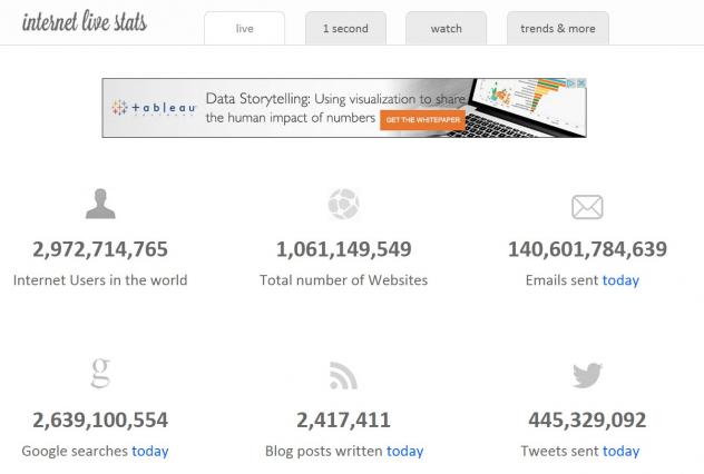 Internet, toujours selon internetlivestats, c'est aussi près de 3 milliards d'utilisateurs, qui écrivent plus de 2,5 millions de billets par jour, plus de 3 milliards de recherches Google effectuées par jour, et environ 170 milliards de mails échangés par jour.