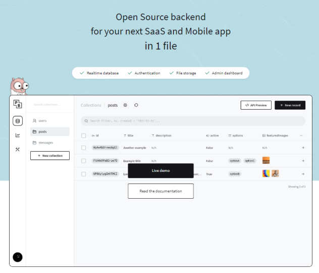 PocketBase est un backend open source écrit en Go. Il peut être utilisé pour des applications SaaS ou mobiles. Il est composé de la base de données intégrée SQLite (sans toutefois nécessiter CGO) avec abonnements en temps réel, d'une gestion intégrée des fichiers et des utilisateurs, d'un tableau de bord d'administration et d'une API REST simple.