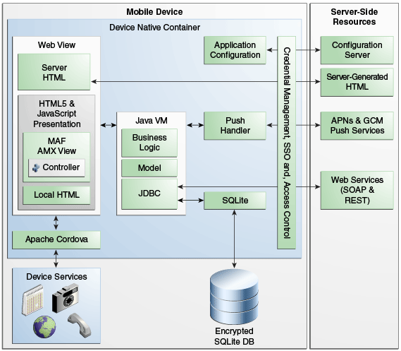 MAF - qui remplace ADF Mobile (auquel il ajoute les notifcations en push ou plus de skins par exemple) - permet de créer des applis iOS et Android en Java (pour le coeur du code), en JavaScript et HTML 5 (pour l’interface) et avec Apache Cordova (pour accéder aux fonctionnalités des appareils comme le GPS ou la messagerie). Les apps ainsi générées embarquent également une base SQLite pour le fonctionnement hors-ligne.