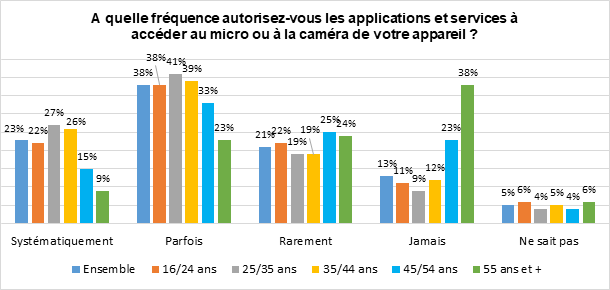 Au cours de l'année écoulée, l’utilisation croissante de la visioconférence dans le cadre du télétravail a entraîné le recours à des applications telles que Microsoft Teams, laquelle a vu son utilisation augmenter de 894 % entre février et juin 2020. De nombreux fournisseurs de premier plan ont fait face à une augmentation inattendue de la demande, entraînant une pénurie quasi mondiale de webcams. Avec l’usage des technologies et applications de visioconférence dans le cadre professionnel, scolaire ou familial, il est compréhensible que les individus autorisent assez spontanément leurs applications à accéder à leur micro et à leur caméra. Selon l’étude Kaspersky, 27 % des 25/34 ans les autorisent systématiquement, alors que chez les personnes plus âgées, 38 % des répondants âgés de 55 ans et plus déclarent ne jamais autoriser ces accès à leurs applications et services mobiles.