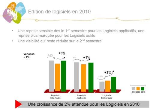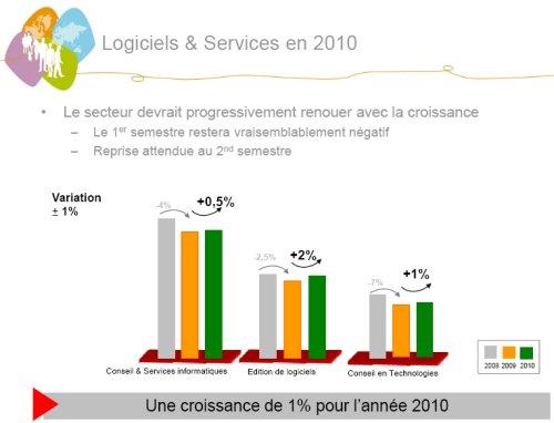 La conférence annuelle du Syntec Informatique tombe souvent un 1er avril. Mais c’est le plus sérieusement du monde bien entendu que le syndicat professionnel présentait le bilan 2009 et les prévisions d’activité 2010. Il rappelait en préambule le poids du secteur : les logiciels et Services, en France, constituent un marché de 40,5 MM€ en 2010. Ils représentent 40% de l’ « économie numérique »net 21 400 entreprises, employant 365 000 personnes. Sa croissance annuelle est plus de 3 fois supérieure à celle du PIB.