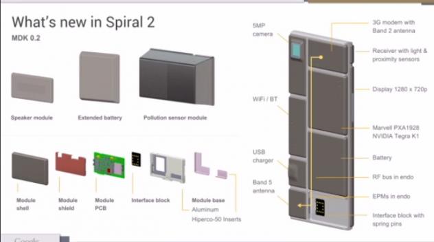 Il y aura un peu retard, cependant le projet Ara continue d'avancer bon train. Ainsi lors de la conférence Project Ara Module Developer’s donnée hier à Mountain View, Google a présenté un smartphone Ara abouti : le Spiral 2. De base, l'appareil embarque des processeurs fournis par Marvell et NVIDA, un écran 1280*720, une caméra 5 megapixels, la Wi-Fi et la 3G.