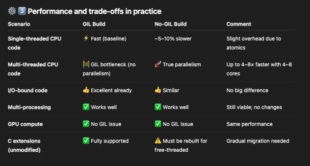 Les gains sont parfois limités, dans certains cas, il faut réécrire le code. Par défaut, GIL reste actif. Vous devez d'abord faire un --disable-gil lors de la compilation. De nombreuses librairies C considèrent que GIL est présent et elles ne sont pas forcément adaptés à un usage sans cette option. A voir comment cette libération sera prise en compte et utilisée.