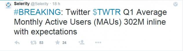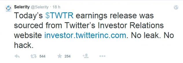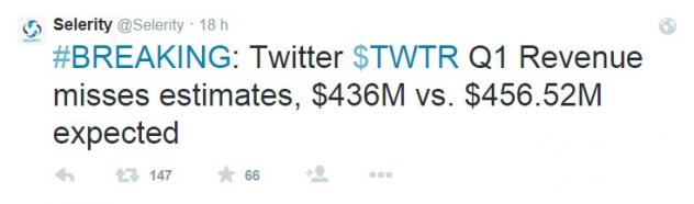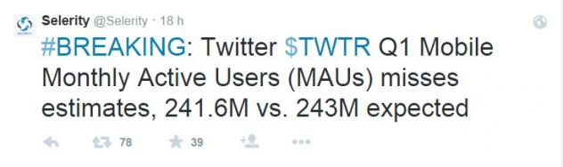 Twitter s'apprêtait à annoncer tout cela, mais sans doute y mettant les formes, pour ménager son monde. Seulement voilà, ironie du sort, une série de tweets ravageurs, postés par le cabinet d'analyse Selerity, a cassé la baraque du site de Microblogging, ceci d'autant plus que Selerity précise que les informations ne proviennent d'aucune fuite, d'aucun hack, mais d'investisseurs en relation avec Twitter.