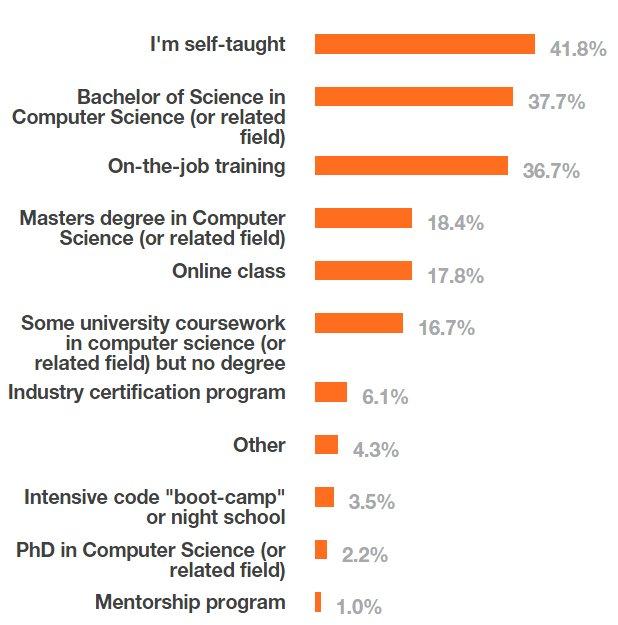 Voici un autre résultat surprenant. L'informaticien autodidacte, aux cheveux blanchis sous le harnais et avec une barbe à la Richard Stallman, il fait partie du passé dites-vous ? Pas sûr du tout. Selon cette enquête Stack Overflow, 41,8% des gens qui écrivent du code sont des autodidactes, et 36.7% ont appris dans le cadre de leur travail. Les diplômés restent les oiseaux rares du métier.