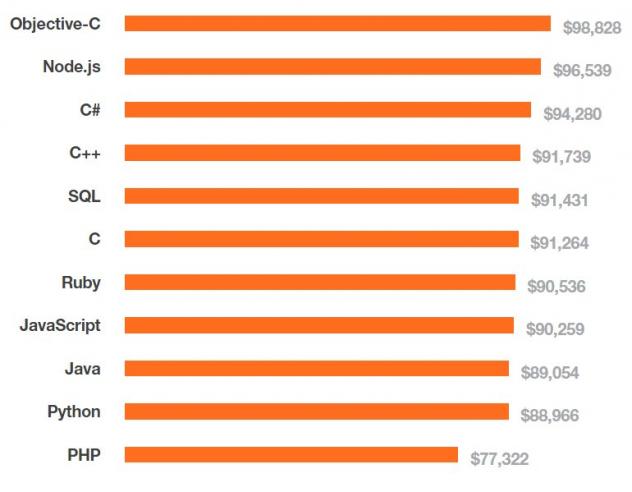 Etre passionné par le développement c'est bien, mais il faut parfois penser à gagner un peu sa vie. Selon cette enquête Stock Overflow 2015, ceux qui gagnent le plus d'argent codent avec Objective-C. Viennent ensuite non pas JavaScript en tant que tel, mais le framework node.js, puis C# et C++. Et oui, le vieux dinosaure C++, non seulement continue de susciter de l'intérêt, mais il permet d'être bien payé. La lanterne rouge de l'étude est PHP. Sans doute parce que les compétences dans ce langage sont trop répandues.