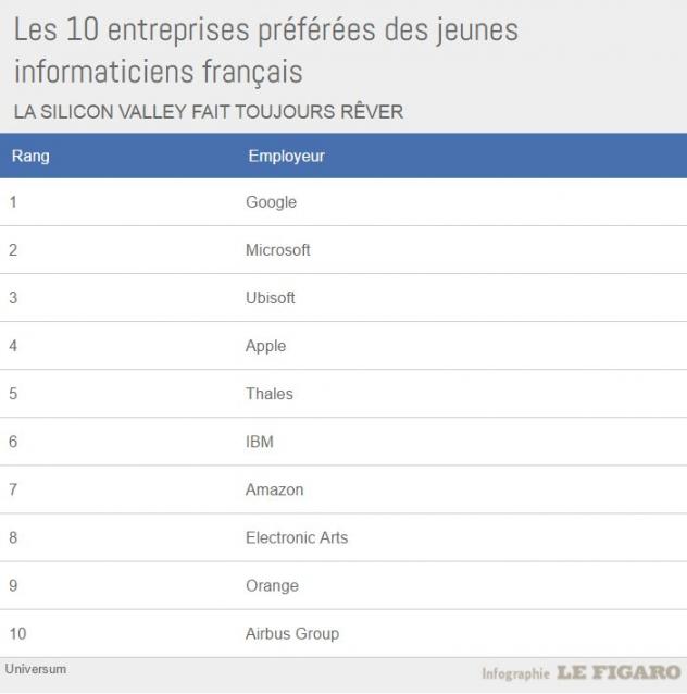 Selon cette étude les géants américains font rêver. D'abord Google, ensuite Microsoft. En troisième position, bonne surprise, vient le français Ubisoft. Puis Apple, Thales (autre français), IBM, Amazon...