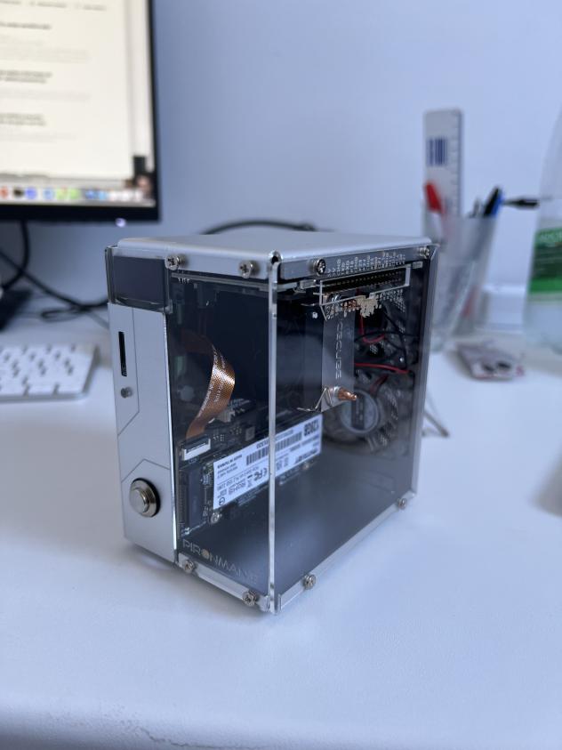 Il existe de nombreux boîtiers pour sa Pi. Nous avons opté pour le Pironman 5 de SunFounder. Le constructeur est bien connu des makers et de l'écosystème Pi. Le boîtier semble intéressant avec une partie transparente, du NVMe M.2, un accélérateur IA Hailo-8L, refroidissement, OLED, etc. Le tout pour -80 €.
