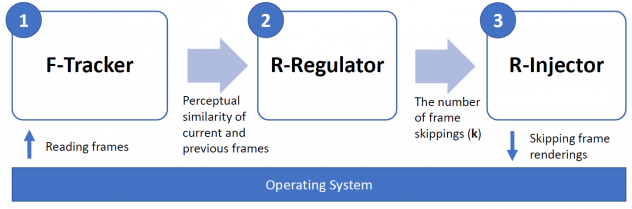 Le système RAVEN se compose de trois composants majeurs qui permettent de faire évoluer le taux de restitution des images de jeu: Frame Difference Tracker ( F-Tracker ), Rate Regulator ( R-Regulator ) et Rate Injector ( R-Injector)). Le système fonctionne à la manière d'un pipeline. Tout d'abord, F-Tracker mesure la similarité perceptive entre deux images récentes. Ensuite, R-Regulator prédit le niveau de similarité entre la trame actuelle et la suivante. La prédiction est effectuée en fonction de la similitude entre l'image en cours et la ou les images précédentes. Si les trames suivantes sont suffisamment similaires à la valeur actuelle, R-Injector limite les taux de rendu des trames en injectant un certain retard dans une boucle de rendu afin d'ignorer le traitement graphique des trames inutiles. Actuellement, RAVEN peut sauter jusqu'à un maximum de trois images, et donc aboutir à une baisse de la fréquence d'images à 15 FPS.