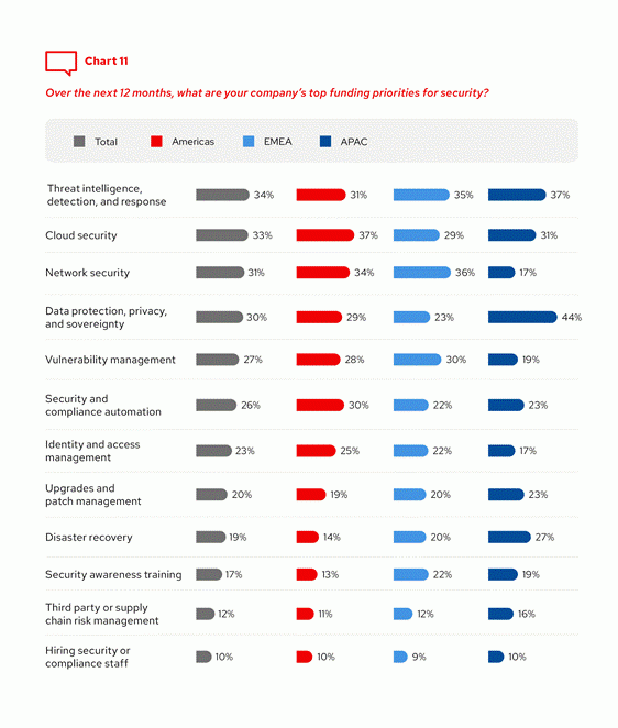 Dans l’ensemble, un tiers des dirigeants interrogés souhaiteraient consacrer un budget plus important à la Threat Intelligence et à la Threat Detection and Response, ainsi qu’à la sécurité dans le cloud. À l’inverse, les dirigeants de la région APAC préfèrent accorder la priorité à la protection et à la souveraineté des données (y compris celles à caractère personnel), ainsi qu’à la reprise après sinistre, plutôt qu’à la sécurité des réseaux.