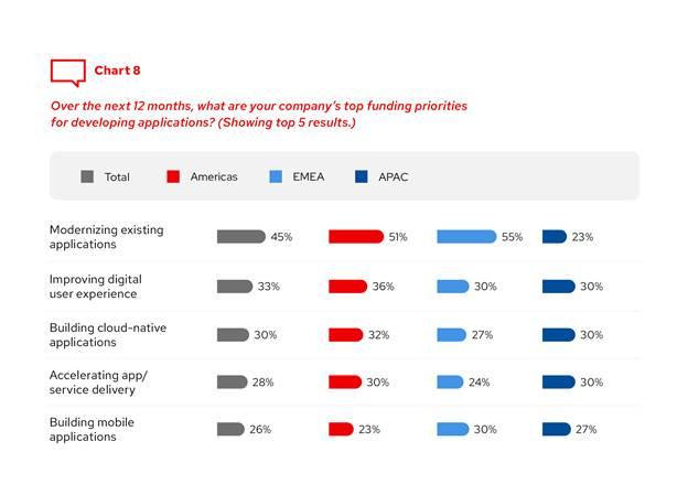 Aujourd’hui, la modernisation des applications existantes constitue la principale priorité de financement (à 45 %) en matière de développement d’applications, suivie de près par l’amélioration de l’expérience numérique des utilisateurs, la création d’applications cloud natives et l’accélération de la fourniture d’applications et de services. Néanmoins, les priorités de financement du développement d’applications peuvent varier selon les régions : alors que les Amériques et la région EMEA affichent un classement de priorités de financement similaire, la région APAC place la modernisation des applications assez bas dans sa liste.