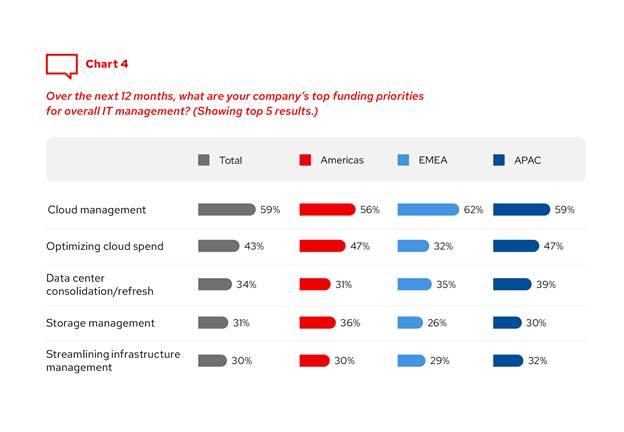 Parmi les autres priorités recensées figurent notamment l’amélioration de l’expérience numérique des utilisateurs, la création d’applications cloud natives et mobiles (davantage priorisé par la région EMEA) et l’accélération de la fourniture d’applications, de services et de nouveaux outils de développement (davantage priorisé par les Amériques).