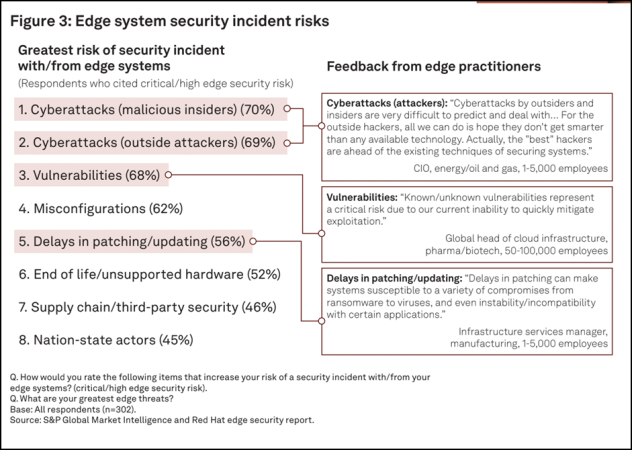 En outre, le rapport indique que les trois principales préoccupations des entreprises en matière de sécurité concernent les cyberattaques – à la fois internes et externes – ainsi que les potentielles vulnérabilités de leurs systèmes. Les entreprises sont pleinement conscientes des risques qui accompagnent l’expansion des infrastructures à la périphérie. Cependant, en investissant dans des outils et des méthodes capables de renforcer les systèmes périphériques contre les attaques – notamment un processus de sécurité « shift-left », la gestion de la supply chain des logiciels et la détection des intrusions –, il est possible de limiter ces risques tout en continuant à récolter les fruits des efforts liés à l’adoption de la technologie d’Edge computing.