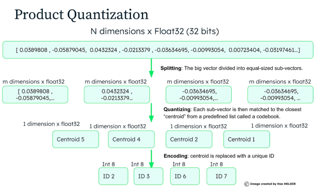 - Chaque sous-vecteur est associé à un centroïde préalablement calculé (via des algorithmes comme k-means).