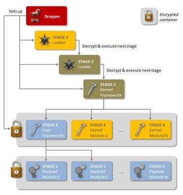 Regin utilise également une approche modulaire, lui permettant de charger des fonctionnalités adaptées selon la cible. Cette approche modulaire a déjà été vue dans des familles de malwares sophistiqués tels que Flamer et Weevil (TheMask), alors que l’architecture en plusieurs étapes est similaire à celle observé dans Duqu/Stuxnet.