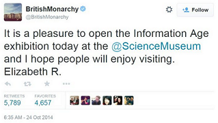 Samedi dernier, à l'occasion d'une visite au Musée des Sciences, la Reine Elizabet II, 88 ans, a posté son premier tweet :