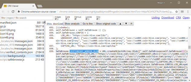 Mais les dernières versions de SafeBrowse ne faisaient pas que ça. L'extension intégrait une bibliothèque JavaScript comportant du code mineur.