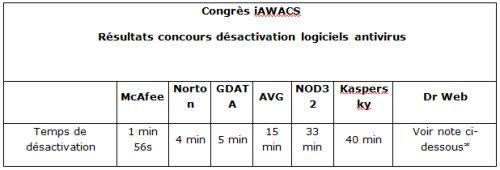Il n’aura pas fallu plus de temps aux experts de la sécurité informatique réunis par l’ESIEA à l’occasion du congrès iAWACS pour désactiver 6 des antivirus les plus répandus sur le marché. Ce concours, s’apparentant à un « test consommateur », réalisé en marge des travaux et conférences d’experts, souligne la rapidité avec laquelle des logiciels antivirus de référence peuvent être désactivés :