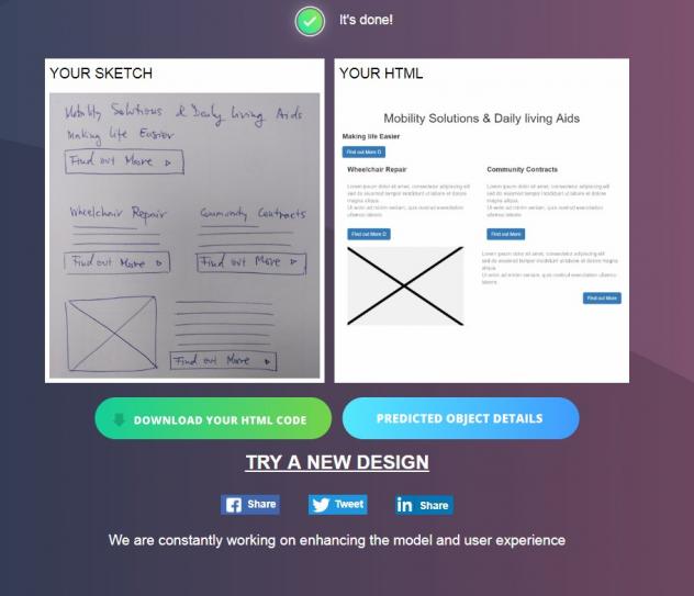 Microsoft a mis en ligne un site de démonstration de Sketch2Code. Vous pouvez y uploader le scan d'un croquis, ou bien demander à ce que votre croquis soit lu par Sketch2code via la caméra de votre poste de travail. Puis vous lancez l'opération.