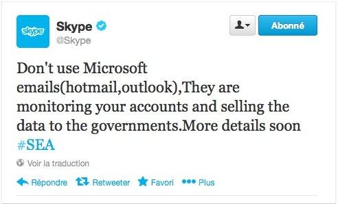 Les pirates ont publié un tweet : "N'utilisez pas le service de mails de Microsoft (Hotmail, Outlook), ils surveillent vos comptes et vendent les informations aux gouvernements"