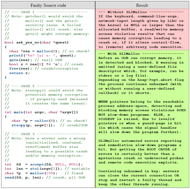 Un français propose une autre voie avec SLIMalloc, qui est une réécriture de l'allocateur de tas SlimGuard. Son concepteur présente SLIMalloc comme capable de bloquer les causes premières de 70-90% de toutes les vulnérabilités passée et futures (en logiciel et dans les puces et CPU) et souligne qu'il est le premier allocateur évolutif capable d'intercepter et de signaler les pointeurs invalides en temps réel.